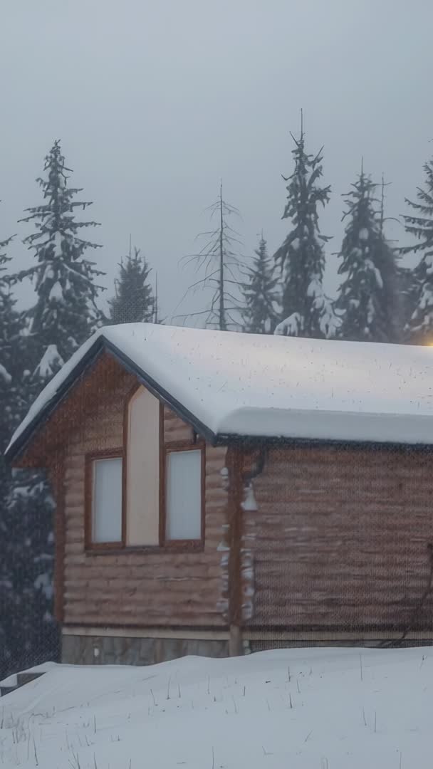 - Snowfall Dusting Mountain Log Cabin at Dusk with Warm Window Glow, Vertical Video