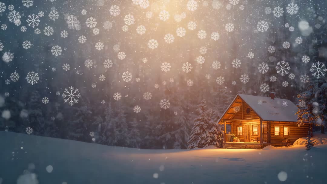 AI Generated Video. Scene capturing gentle snowfall intensifying into large flakes over forest clearing while cozy log cabin glows at twilight. Composition providing wide negative space on left for headlines, text overlays, or logo placement. Warm interior light contrasting cool blue tones for dramatic cinematic mood, evoking comfort, solitude, seasonal nostalgia. Perfect for marketing winter retreats, holiday promotions, seasonal greeting cards, travel commercials, website hero banners, social media posts. Working well as looped background for video projects, title sequence, or transitional shot, and for print use on posters, brochures, packaging. Suggesting gentle color grade and slow push-in camera movement to enhance cozy atmosphere.