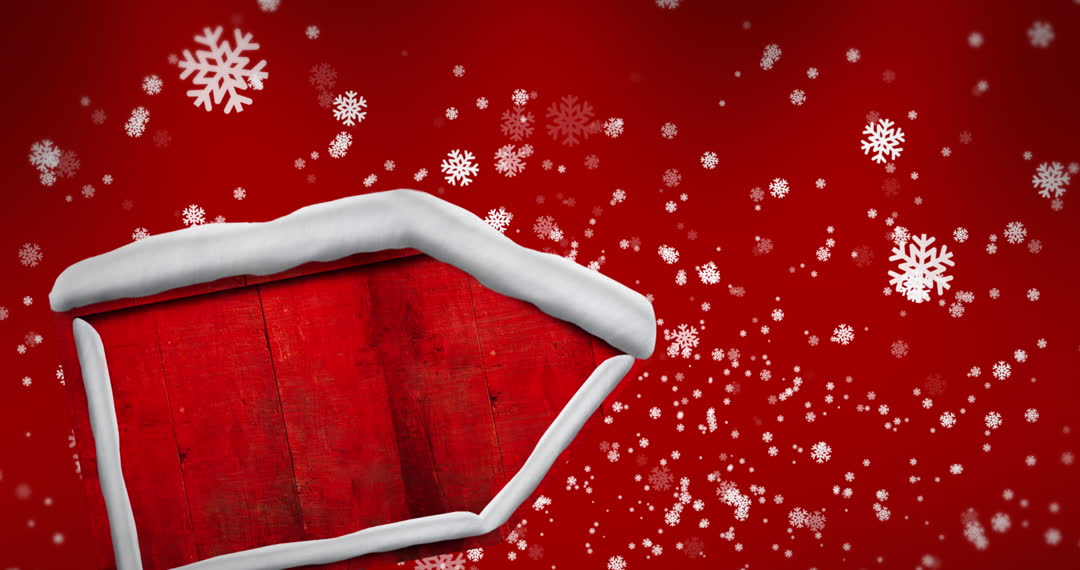 This festive design features snowflakes fluttering over a rustic red wooden sign adorned with a thick, snow-capped frame. The vibrant red background creates a warm holiday feeling, perfect for Christmas season themes. Ideal for holiday greeting cards, festive invitations, or as a decorative element in winter marketing materials.