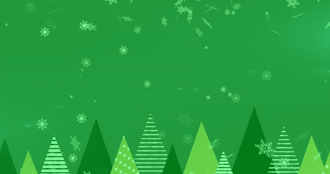 Captures a festive winter scene with snowflakes falling onto stylized green Christmas trees. Ideal for holiday cards, invitations, or seasonal advertisements. The ample green background with soft falling snow creates space for customized messages or greeting text.