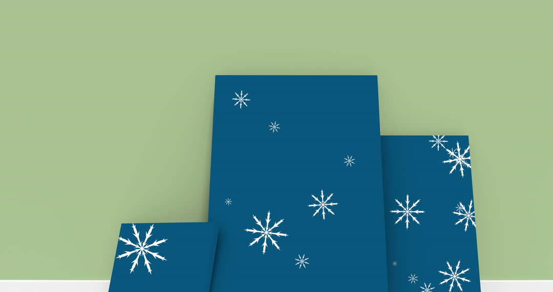 Graphic depicting snowflakes on blue frames that lean against a wall, ideal for winter-themed decorations and holiday marketing materials. Can be used to promote Christmas events or in invitations and seasonal flyers to convey a festive ambiance.