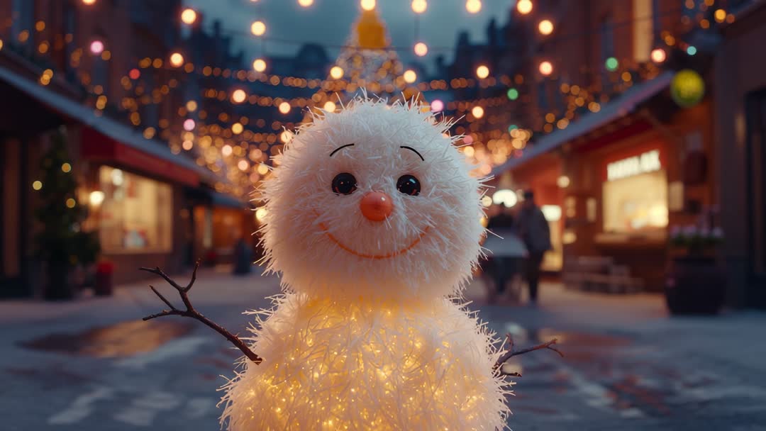 AI Generated Image. The scene captures a luminous snowman glowing warmly as sparkling lights around it set a festive mood on a picturesque market street lined with colorful decor. The depth of field emphasizes the enchanting Christmas ambiance with pixels of twinkling bulbs illuminating the frosty surroundings. Viewers visually journey down the cozy, winter market path which mirrors an ideal-like Christmas environment making it perfect for holiday-themed projects or socio-marketing campaigns focused on festive celebrations that draw in the season's spirits.