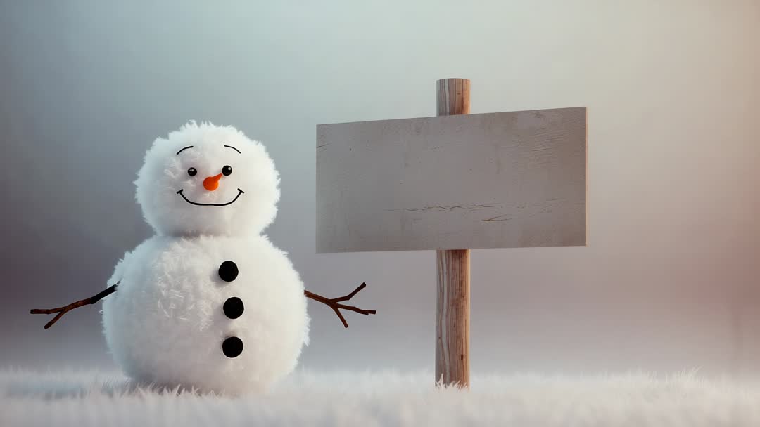 AI Generated Image. Video illustrates process of assembling a joyful snowman on a frosty surface. Features creation of face, placement of a carrot nose, adding buttons for eyes and a smile, and attaching twig arms. Beside the snowman, a wooden signpost stands, offering a space for personalized messages. Ideal for holiday tutorials, festive decoration inspiration, and winter-themed promotional content.