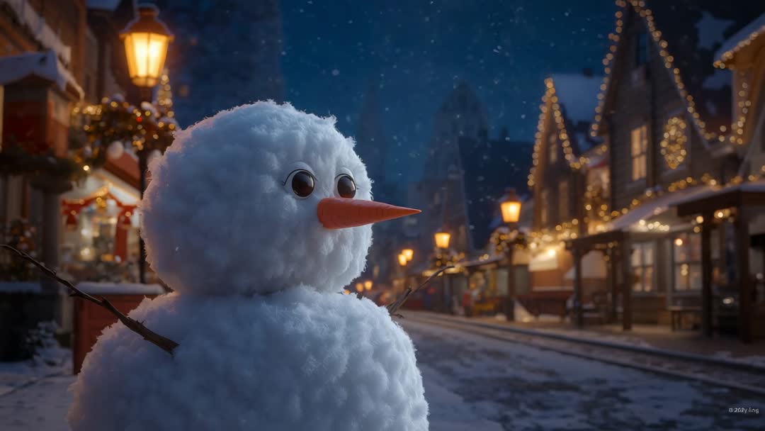 - Snowman Enjoys First Snowfall in Festive Village at Night