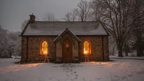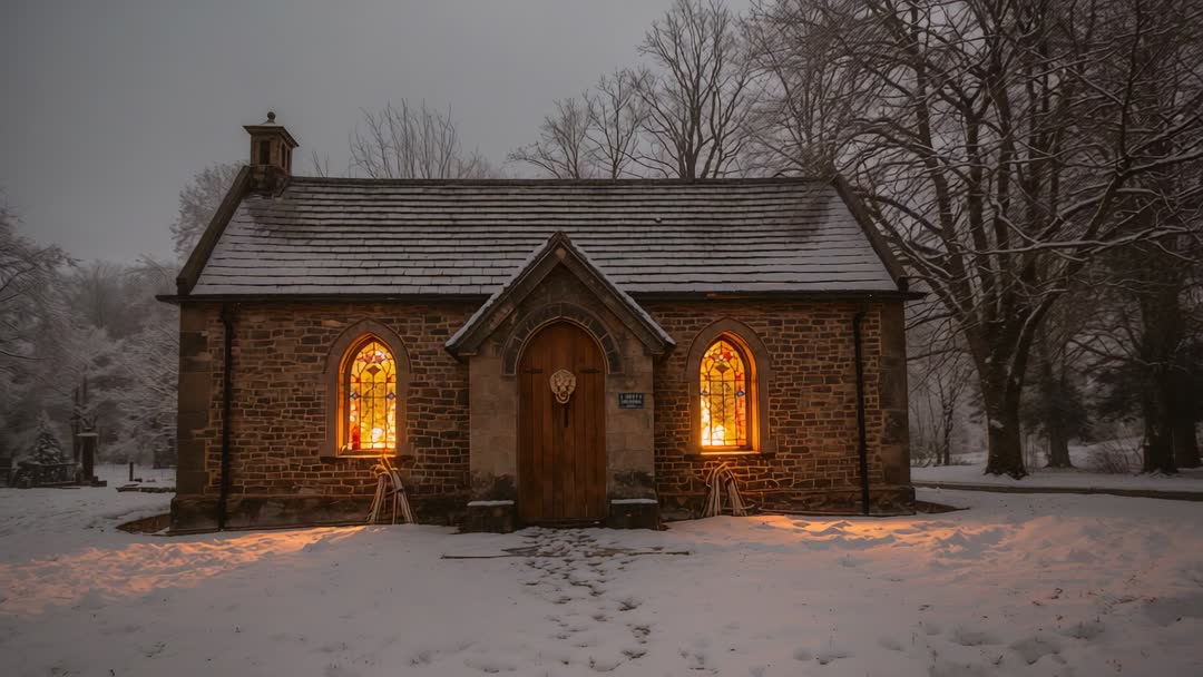 AI Generated Video. Video clip showing small stone chapel during winter dusk, warm stained-glass windows glowing, snow blanketing ground and footprints stopping at steps. Featuring centered symmetrical composition, soft ambient light, warm-cold color contrast, misty background trees and quiet tranquil mood. Working well for website hero banners, seasonal holiday greeting cards, church service or event promotion, historic site or cemetery editorial, travel and tourism marketing, atmospheric film or TV establishing shots, book covers or social media posts. Offering room for title or text overlay in sky area, looping clip potential for background video, high-resolution still extraction for print use. Ideal for conveying solitude, warmth, nostalgia, winter faith and peaceful evening atmosphere.