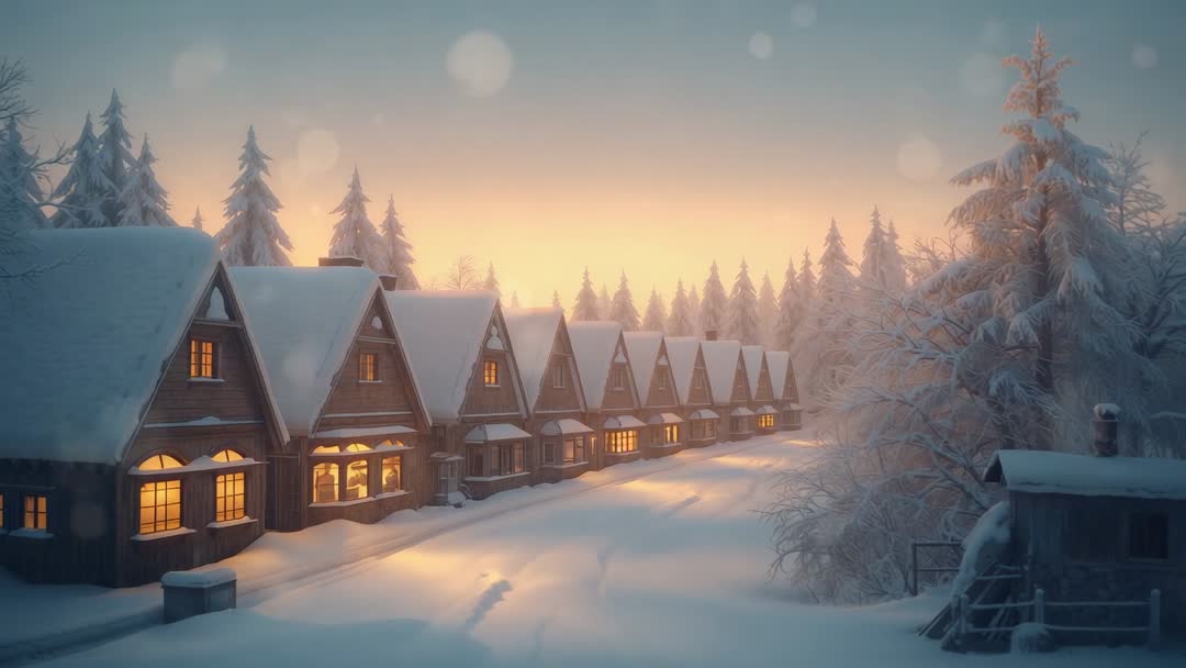 AI Generated Video. Footage showing snow-covered cottages lining quiet lane at sunrise, camera pushing forward past warmly lit windows and frosted pine trees. Lighting bathing scene in soft golden glow, creating cozy tranquil mood and strong seasonal atmosphere. Use for holiday marketing, winter travel promos, festive social media reels, seasonal website banners, greeting card animations, and cinematic openers for tourism or real estate projects. Ideal for adding text overlays, logo stings, slow music beds, or voiceover narration. Color grading welcoming warm-cool contrast and slow motion or subtle stabilization enhancing cinematic feel.