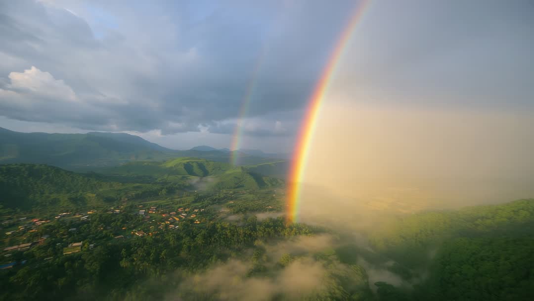 AI Generated Image. This dramatic aerial video captures a mesmerizing double rainbow arching majestically over a lush tropical valley. The mist adds a dreamlike quality as the drone smoothly glides overhead, revealing verdant hills and a quaint village scattered below. Ideal for travel websites, nature documentaries, or serene mood settings in media projects.
