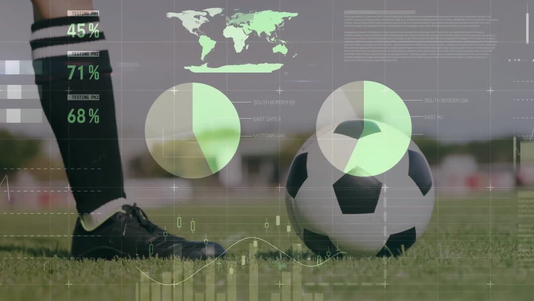 This video showcases a blend of soccer and high-tech data analytics, depicting intricate data overlays while a player prepares to kick the ball on a field. Useful for illustrating the integration of technology in sports, discussing the future of athletic analytics, or promoting digital solutions in sports management.