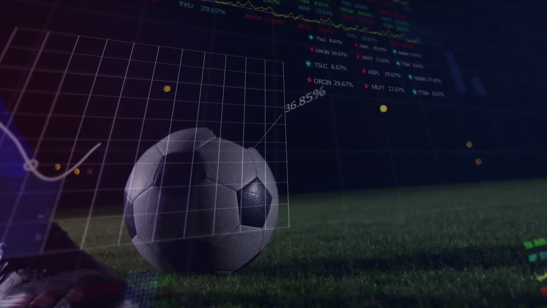 An edited scene blends soccer with financial data graphics, suggesting the intersection of sports and business analytics. Suitable for use in articles about the business side of sports, sports tech innovations, or financial investment in athletics.