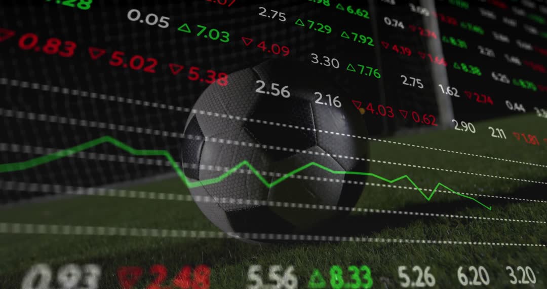Visual demonstrating soccer betting environment with a ball on a pitch and digital odds increasing interest for gamblers and analysts focusing on match outcomes and sports investing.