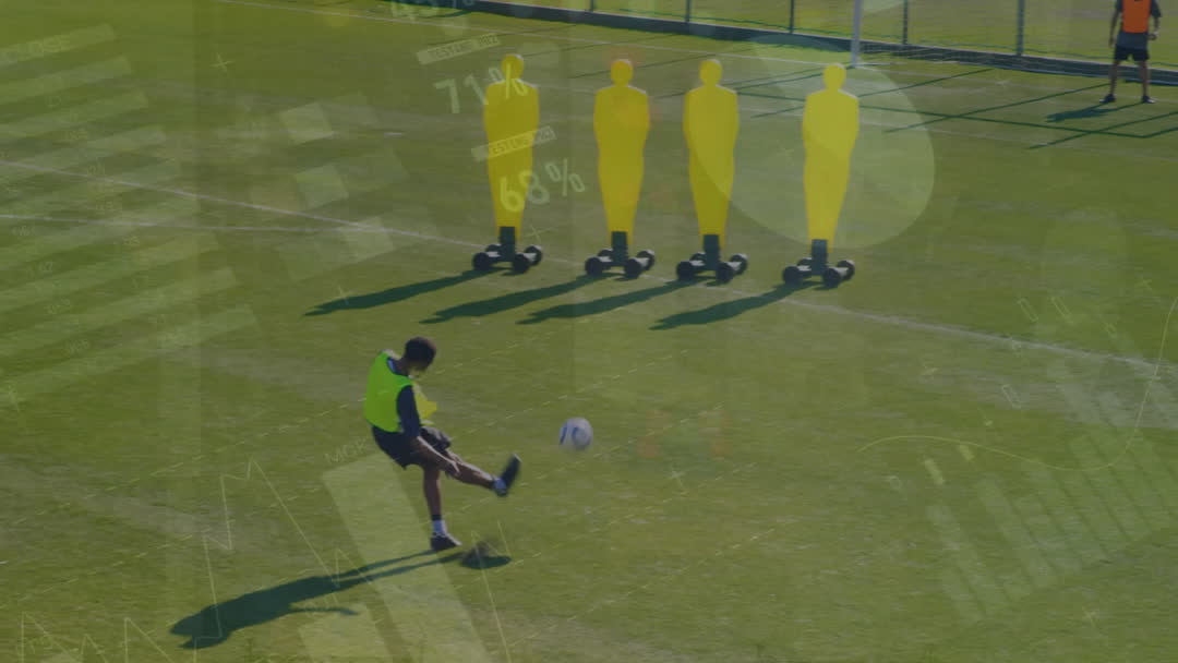 Exciting display of a soccer player practicing a free-kick on a field with statistical data overlay in bright colors. The visual combination of athletics and technology highlights modern analysis tools used for performance enhancement. An excellent choice for topics related to sports technology advancements, data in athletics, or football training. Perfect for articles, presentations, or video content focusing on the integration of sports with digital analytics.