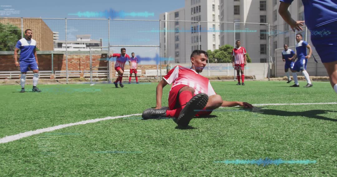 This dynamic scene captures a soccer player performing a slide tackle during a match on an urban turf field. Transparent HUD overlays suggest sports analytics monitoring, adding a futuristic element to the active competition and teamwork spirit depicted. Perfect for educational content on sports dynamics, articles focused on analytics in athletics, or advertisements for soccer equipment featuring competitive and outdoor athleticism.