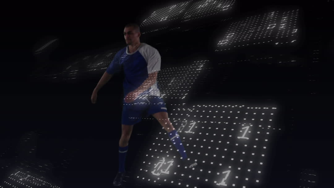 Soccer player in dynamic pose against binary coding and glowing dots symbolizes the merging of sports and technology. Ideal for illustrating concepts in modern digital advancements in athletics, sports analytics, virtual training, and innovative tech solutions in sporting worlds.
