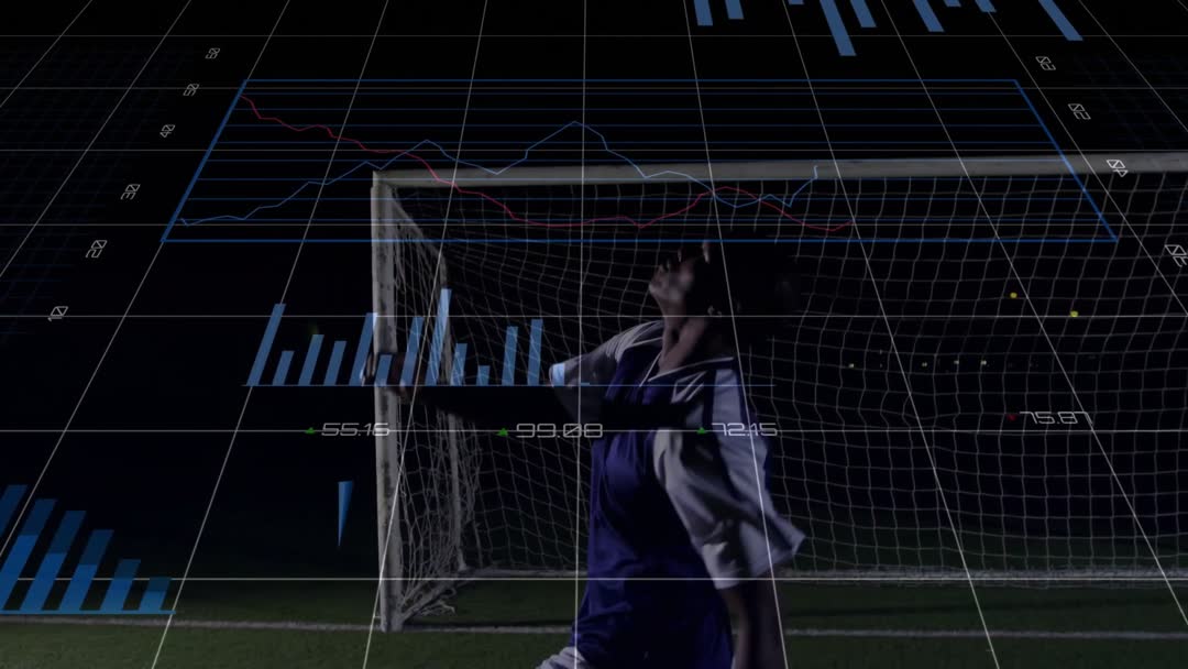 Footage illustrates intersection of sports and technology showing soccer player executing a bicycle kick alongside data charts suggesting performance monitoring. Perfect for creative video ad campaigns targeting sports technology, training programs, team performance analysis tools, or digital broadcasts on innovation within athletics.