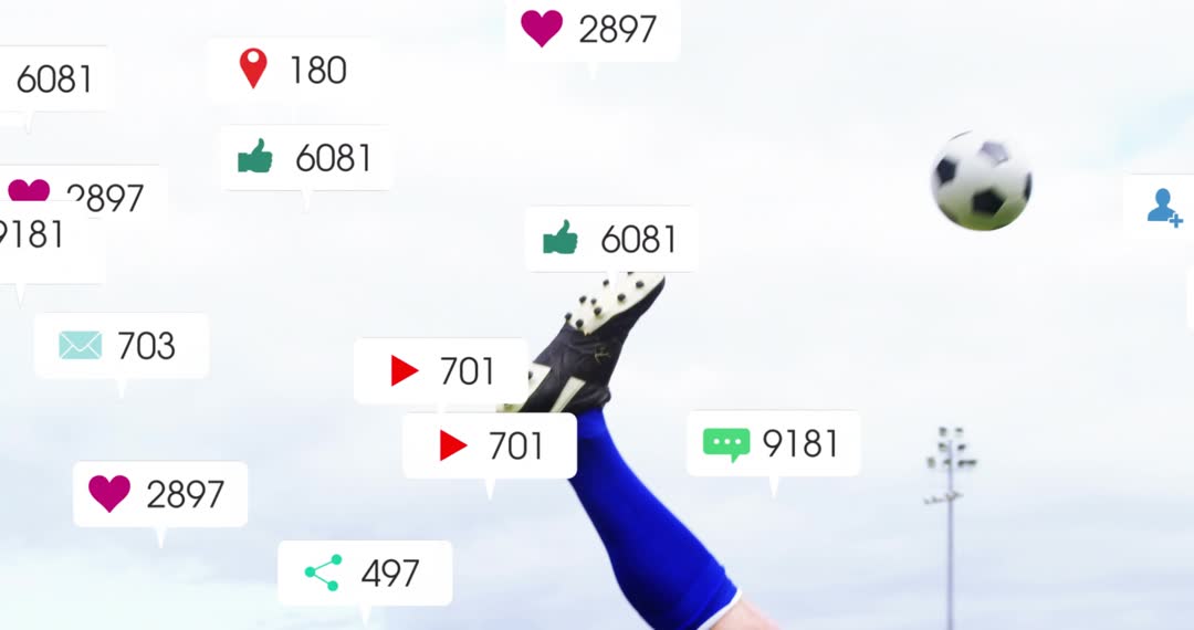 Soccer player energetically performing a bicycle kick as floating social media engagement icons surround him. Emphasizes the interaction of sports with digital popularity. Suitable for themes covering sports influence in online platforms, athlete fanbase growth, and athletic branding.