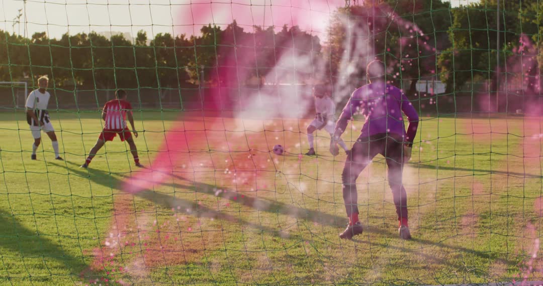 Footage captures a thrilling soccer moment with a goalkeeper diving to save a shot while colorful particle effects trail the ball, adding a fantasy element to the action. Perfect for projects focusing on sports highlights, dynamic motion graphics, or promotional material conveying excitement and energy in athletic events.