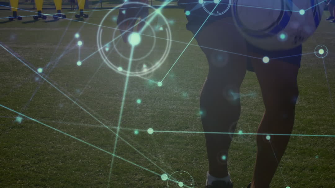 A soccer player practices on a field with dynamic digital data graphics overlaid, symbolizing the integration of modern technology in sports. This video is ideal for topics on sports analytics, digital transformation in athletics, training advancements, and innovative approaches to sports management.