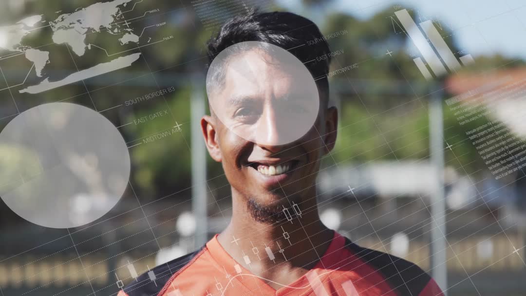 A male soccer player is standing outdoors, overlaid with futuristic HUD charts and a world map. This modern depiction highlights the blend of athleticism and technology through sports analytics. Perfect for concepts in tech sports integration, innovative athlete training, or digital transformation in sports. Useful for illustrating advanced sports techniques or futuristic athletic training methods.