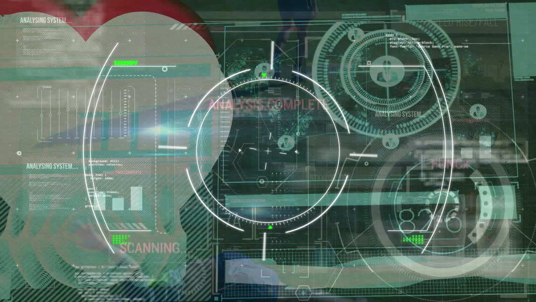 This dynamic visual features an animated aspect of soccer players with an overlay of data displays and interface elements. Bright data graphics show typical sports tech indicators like scanning and analysis completions, offering a futuristic touch. Ideal for content on sports technology innovations, data analysis in sports, or electronic sports journals.