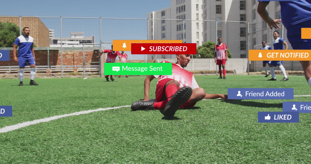 Image depicts diverse male soccer players actively engaged in a match on a field, overlaid with various social media icons such as 'Subscribed', 'Message Sent', and 'Liked'. Scene portrays the integration of sports with digital media interactions, highlighting modern cultures, promotion, and marketing. Useful for illustrating concepts in technology, sports promotions, or digital engagement presentations.