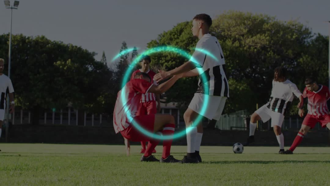 Soccer players demonstrating teamwork and unity on the field with a glowing circular animation overlay adding a futuristic effect. High-energy moment captures athletes supporting each other, embodying sportsmanship and collaboration. Ideal for use in campaigns focused on sports dynamics, teamwork advertisements, and educational content about sports integrity.