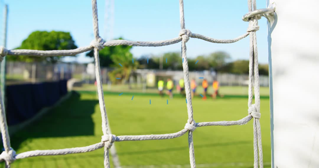 Soccer field view through the goal net, emphasizing focused and individualized sports training and coordination. Suitable for promoting youth athletic programs, coaching strategies, or events focused on football. Utilized in sports-related articles, blogs, or websites.