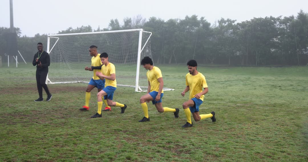 Soccer Players Warming Up on Foggy Field with Coach Video