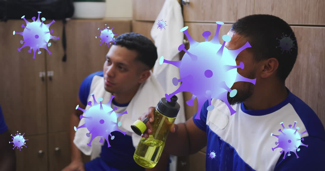 Two Hispanic male soccer players sit in a locker room with COVID-19 virus icons overlaid for emphasis on the pandemic era and its impact on sports. They are dressed in sportswear, taking a break, highlighting their efforts to stay safe and hydrated during challenging times. Useful for discussions on sports management, health measures in group sports, pandemic play guidelines, and athletes protecting themselves from illness.