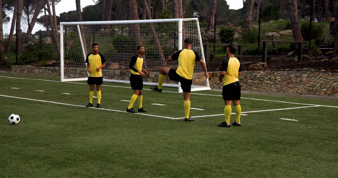 Four soccer players in yellow jerseys practicing on a field, with one kicking near a ball. This scenario depicts teamwork and preparation, suitable for marketing sports events, promoting athletic apparel, or illustrating teamwork concepts.