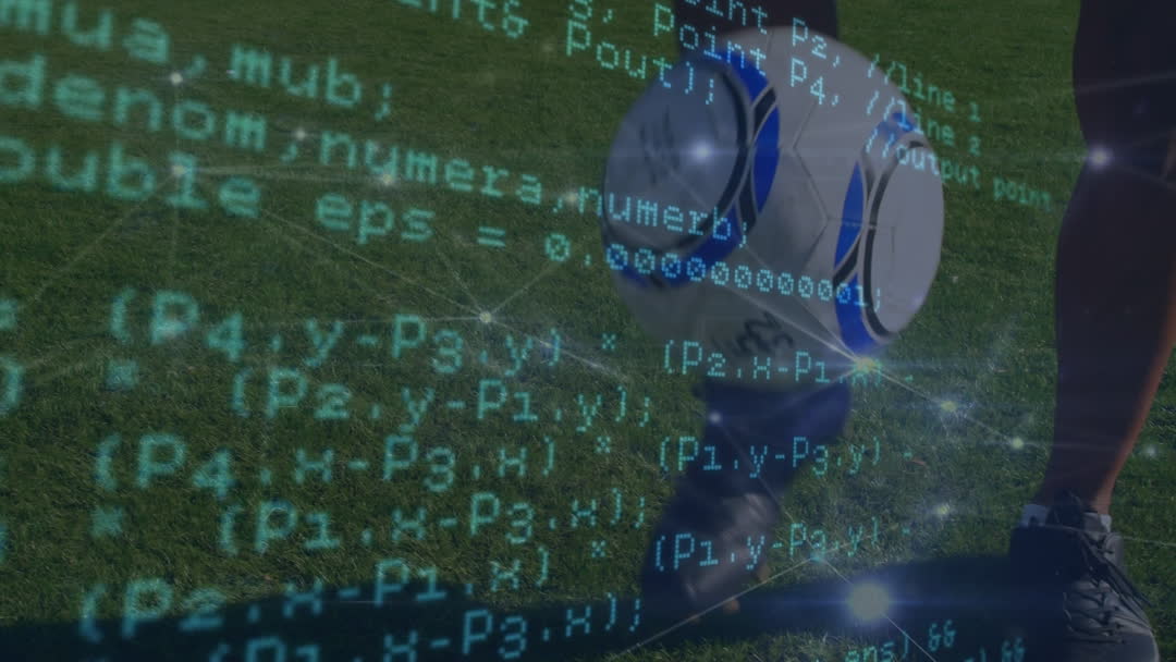 Dynamic blend of soccer and technology highlighting concept of integrating data and analytics in sports. Great for showcasing advancements in sports technology, enhancing performance through data, and educational use in sports-related technology projects.