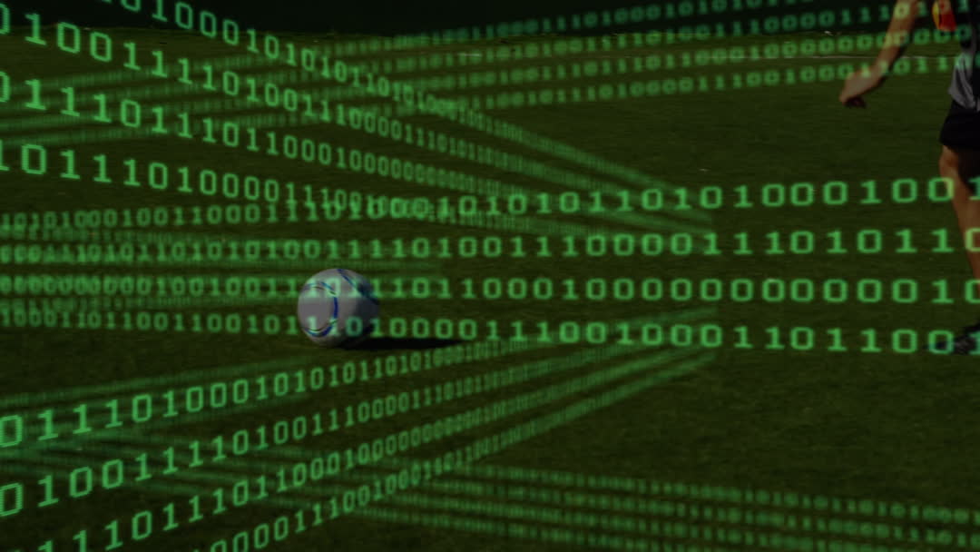 Image captures soccer training enhanced with digital data overlay. Comprised of numbers and symbols, this engaging visual metaphor emphasizes the role of data analytics in sports. Useful for projects discussing the impact of technology on athletic performance or showcasing technological advancements in sports training and analysis.
