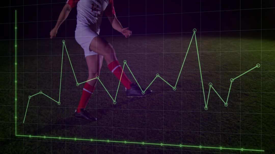 This depiction illustrates the integration of technology and sports. The animated green graph combined with a soccer player dribbling indicates the use of data analytics to assess and improve performance. Suitable for promotions related to sports analytics software, technological advancements in soccer training, or articles discussing data-driven performance enhancements.