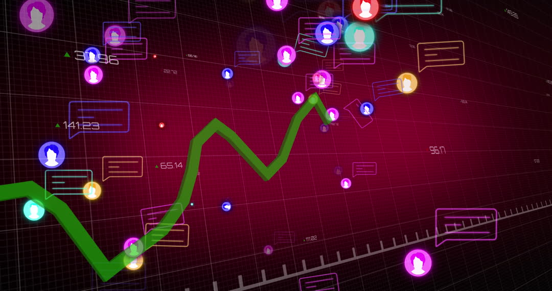 Digital rendering of a green line chart on grid background with social media icons, speech bubbles. Represents growth strategy and data analytics in online communication platforms. Ideal for content about online trends, social media strategy, and data-driven decision making.