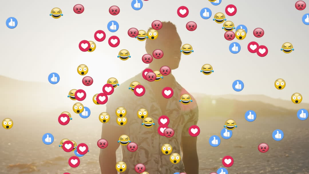 Colorful social media reaction icons over blurred background, visually representing viral interaction concept through various emojis. Suitable for presentations on social media impact, digital communication studies, teaching material, or blog visuals exploring social behavior online. Captures modern expression of emotions through technology interface.