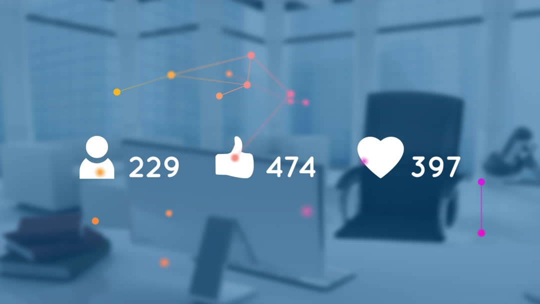 A dynamic depiction of social media data processing in a contemporary office environment shows interconnected icons symbolizing user metrics and engagement. The digital elements overlay a blurred office background, illustrating technology integration in workspace settings. Ideal for illustrating digital marketing strategies, analytics tools, and futuristic workspace concepts.