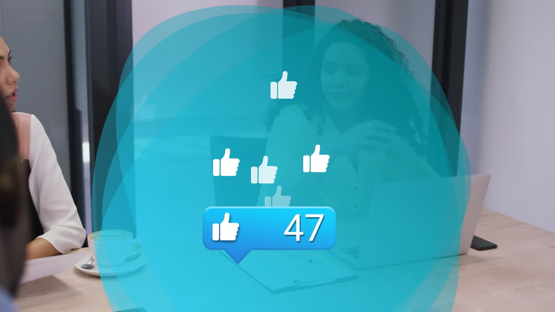 Business professionals gather in a modern office, surrounded by animated social media icons symbolizing engagement and connection. This visual can be used for presentations, articles, or marketing materials focusing on digital marketing success and the importance of social interaction in business.