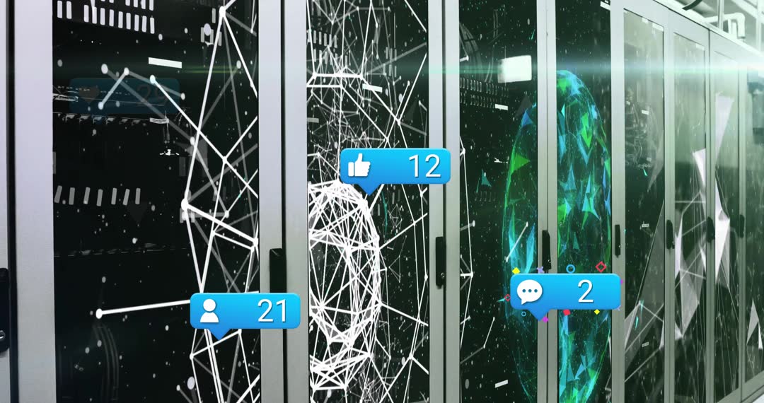 Digital elements symbolizing a network's connectivity appear above futuristic servers, emphasizing concepts like online engagement and data interactions. Icons portraying likes and comments introduce a layer of social media activity in this advanced data scenario. Perfect for illustrating content Creators goods interpreting data interaction, impact technology emphasis, and media engagement dynamics.