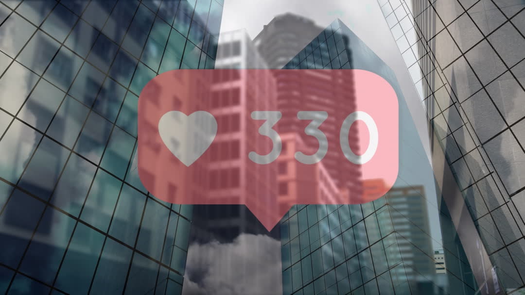 Cityscape with heart icon illustration merges urban architecture with the concept of social media engagement, highlighting digital connectivity. Ideal for marketing campaigns, technology articles, and presentations focusing on smart cities or digital interaction within modern business environments.