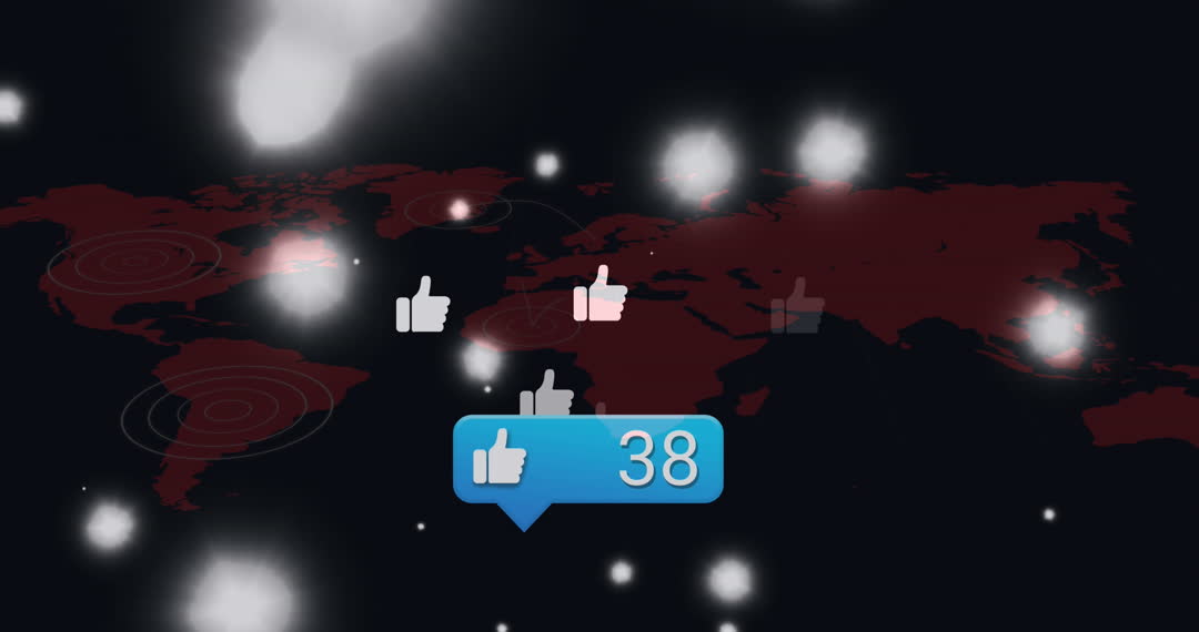 Animation depicting increase in likes with digital thumbs up icons emerging around world map highlights concept of global connections. Useful for illustrating topics related to social media engagements, technological advancements, or digital communications. Can enhance presentations or campaigns focused on emerging network trends or showcasing virality and reach in digital platforms.
