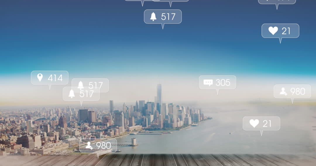 Social Media Engagement Symbols Overlayed on Skyline Video