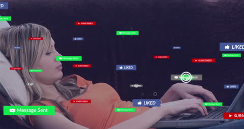 Young Caucasian woman lying on couch using laptop, surrounded by social media engagement icons like messages and likes. This visual representation of virtual interactions highlights the pervasive presence of technology in daily life. Ideal for illustrating social media, digital communication, and online culture themes in educational or promotional content.