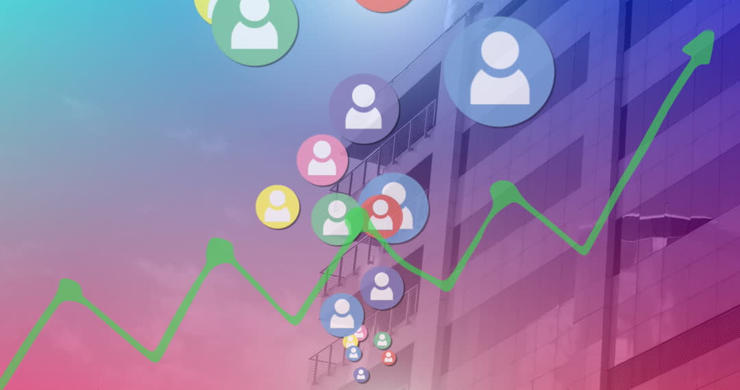 Colorful social media icons representing users are floating against a dynamic backdrop with a rising graph, illustrating growth and network expansion. Useful for articles and presentations on social media trends, digital marketing, business development, and technological advancements.