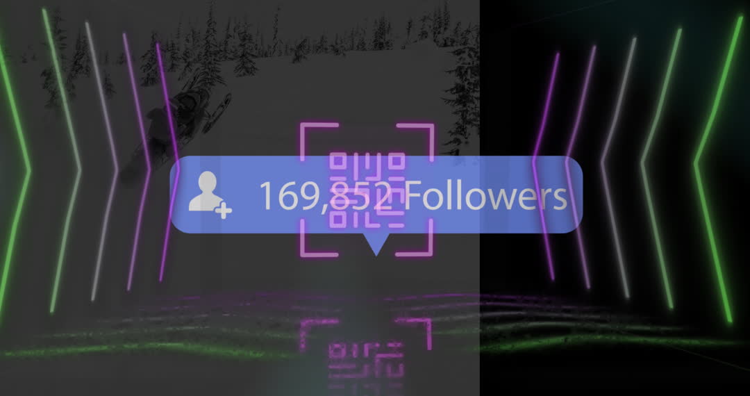Neon graphics surrounding a social media followers count, enhanced by digital interface elements like QR codes and neon lights. Ideal for use in presentations or articles discussing social media growth, digital marketing strategies, technology advancements, or branding promotion.