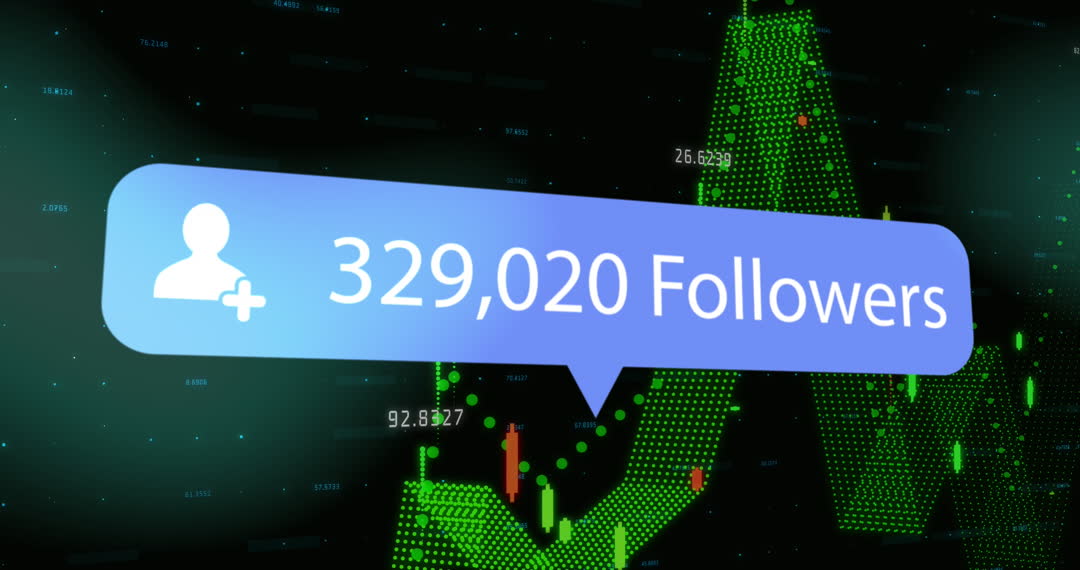 Digital graphic displaying social media growth indicated by the substantial number of followers against a backdrop of financial data graphs represented in a futuristic, digital style. This video is ideal for use in presentations or materials related to social media marketing analysis, business growth strategies, and online influencer impact. It can be featured in digital influence reports, marketing strategy layouts, or technology blogs about data-driven decisions.