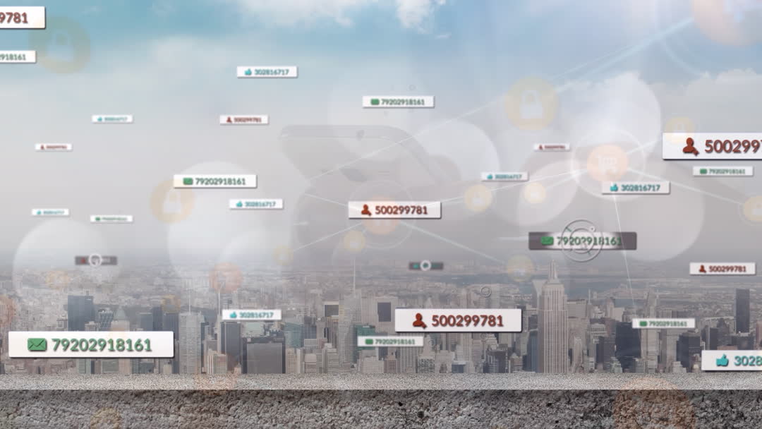 This animated scene depicts a cityscape overlaid with digital icons and connections representing global social media interaction and networking. The concept could be utilized for material related to technology blogs, digital marketing campaigns, or data network articles emphasizing the interconnectedness of urban environments and global communications.
