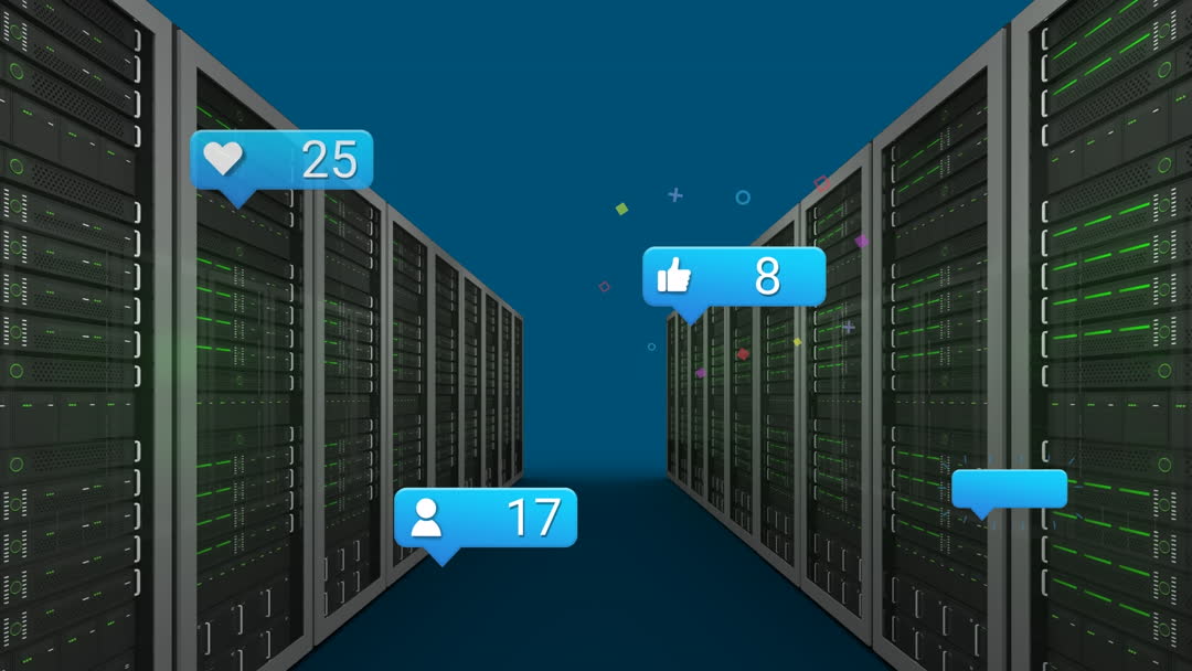 Shows social media icons like likes and followers hovering over server racks, representing digital interaction and internet connectivity. Useful for illustrating concepts of data processing, technology infrastructure, or online networking in presentations or websites about IT, social media impact on business, or data centers.