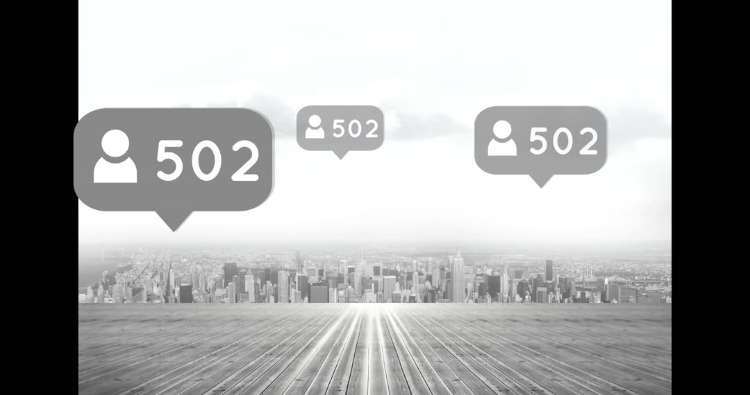 Monochrome video showcases digital interaction as social media icons featuring followers counts float above a sprawling cityscape. Perfect for illustrating social media's influence on urban life, presentations on networking trends, or digital marketing strategies.