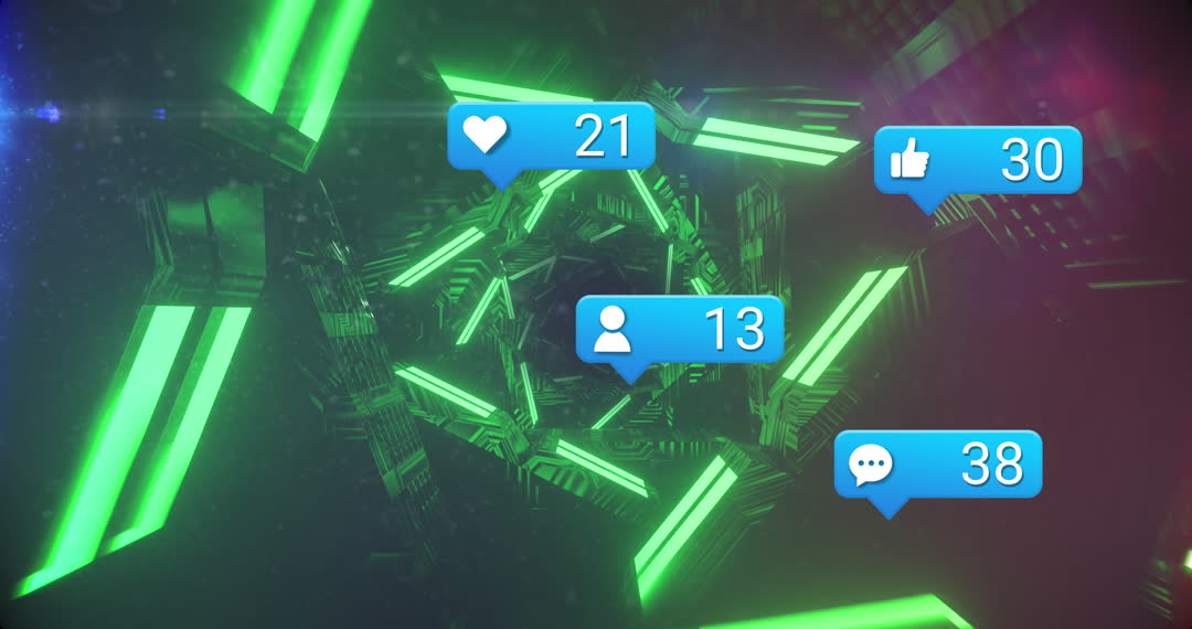 This artwork displays various social media notification icons overlaying a vibrant digital tunnel adorned with neon green lights. Ideal for usage in digital marketing, exploring online engagement trends, or in presentations about social media influence.