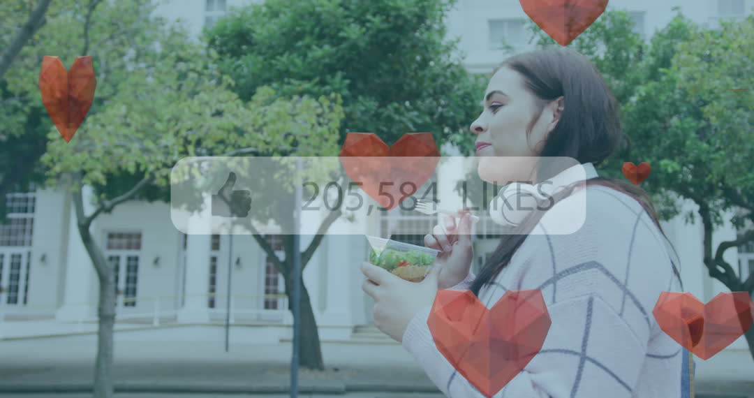 Image illustrates impact of social media on everyday life with animated likes over young woman holding salad in urban area. Appealing for articles on social media influence, digital marketing, or modern urban lifestyle. Suitable for illustrating concepts of online engagement or influencers in technology blogs or online content articles.