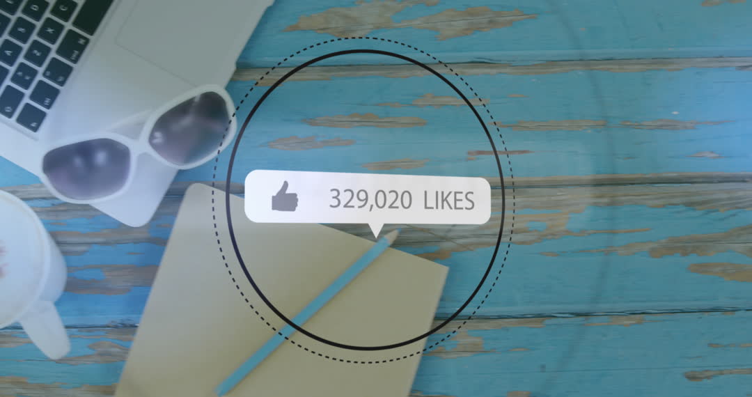 This video illustrates rising social media likes, providing a visual representation of engagement analytics. With a rustic wood background and scattered office items like a diary, laptop, and sunglasses, it embodies modern lifestyle aesthetics. Perfect for use in online marketing campaigns, social media growth presentations, or content creation workshops aimed at understanding digital influence.